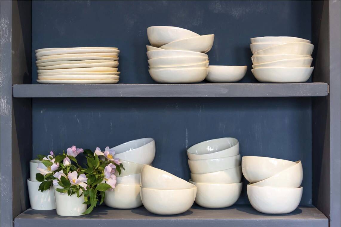 Je crée, dans mon atelier, des objets utilitaires qui répondent à la fois à une fonction et à un besoin d’esthétique. Tous sont entièrement fabriqués à la main, chaque pièce est unique. Je privilégie les formes simples et épurées, l’émaillage monochrome par goût et, s’agissant de la vaisselle, pour mettre en valeur le contenu.